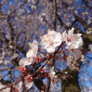 こんにちは😃 23日にあんずの開花宣言が出ましたので あんずの里まで行ってみました 駐車場のものです ここのものはみんなこのように濃い色でとても可愛いです あんず祭りは中止となってますが 結構人が出てました 土日が満開となりそうですが お天気が良くないとのこと 晴れてますのでちょうど綺麗な青空と撮れました💖🥰🤗