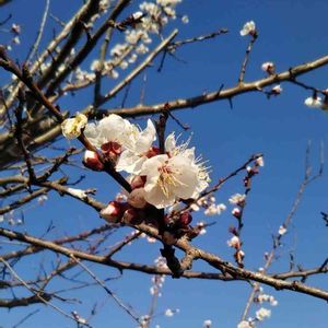 花郷園の帰り道 あんず通りを歩いて駅まで。 あんずの花が咲き始めています😆 ピンクの可愛い花🌸が青い空に綺麗✨ 可愛いクリスマスローズを手にルンルンの帰り道でした。