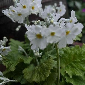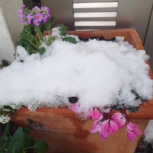 近くの山まで雪が降ってきました。 雨にあたってないさくら草を❣️