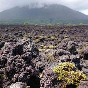 約280年前の噴火で流出した溶岩の岩原。 植生の回復が遅いそうで、280年経った今でも大部分がコケ、地位類がまばらに見えるだけ…。 岩手県岩手山焼走り熔岩流にて