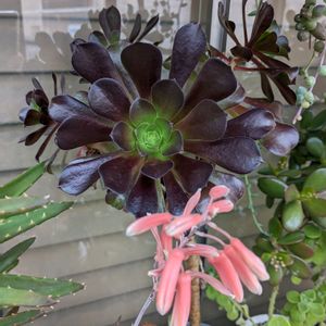 💚カシミアバイオレット(アエオニウム属)+ラウアイの花(アロエ属)💚 🏠我が家の庭の住人紹介🥰 R6年2月1日撮影📷