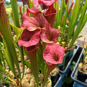 サラセニア交配種 ムーレイ系の交配種です。 筒が開く前後までは黄色っぽい筒でしたが開いて間も無く真っ赤に染まります。筒上げも良く栽培場を彩ってくれてます😄