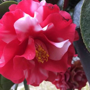 八重椿 まるっと大きなお花💕 十数年前に前に家が建って日陰になってしまい、上へ上へ枝が伸びて高いところに咲いてしまう💦 今年は思い切って、剪定します。