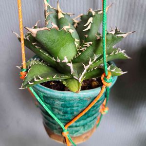 アガベ チタノタ 福建白鯨をお迎えしました。抜き苗で送ってもらい陶器タンブラーに穴を開けて植え付けました。置くところ無いので吊り下げです。