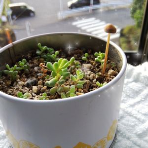 2階の窓辺に置いてたタイトゴメの鉢に小さいキノコがニョキ!🍄😃 いったい どこから?🤔?