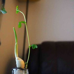 豆苗とニンニク 芽が出ていたニンニクを一欠片育てている。 豆苗は1粒だけ一緒にしてみる。 とくに根っこに癒されている😌