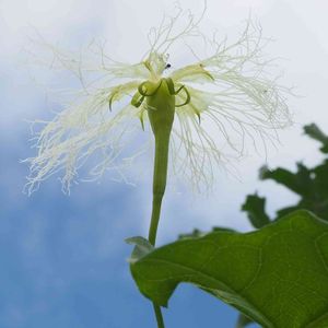 カラスウリより小さいです。 お昼間でも咲いたまんまです。 ヘビウリと教えて頂きました♪