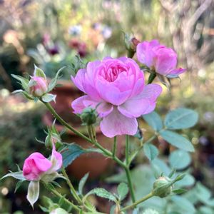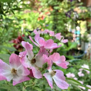今朝の庭から… 8:37〜8:45 雨上がりの朝に〜 3️⃣ 挿し木したレイニーブルーに花が♡ 4️⃣ パンダスミレ🐼が大鉢を占領か.. 5️⃣ バラは薄ピンクがロココ 赤はボーリング状態のルージュピエールドゥロンサール😞