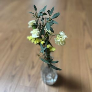 ホームセンターで購入!! ユーカリ、スターチス、カーネーションの組み合わせでした。