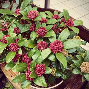 3年目のスキミヤさん💕 枝かずは増えましたが大きくならずまとまっています。 今季は寄せ植えせずにお一人様で😌