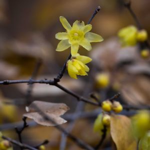 ソシンロウバイ(素心蝋梅) フラワーセンターにロウバイを見に行きました。 残念ながらまだほとんど蕾でしたが、わずかに蝋細工のように美しく咲いていました💛 鼻を近づけると水仙のようなとても良い香りがしましたよ(*˘︶˘*).。*♡
