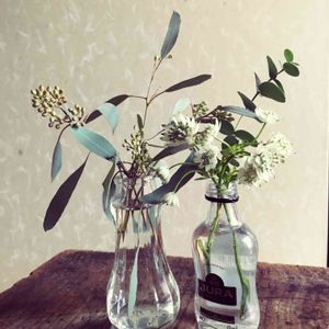 ガラス瓶三連に残った花材も無駄にせず飾っています。庭花を活けても素敵。