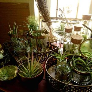 DIYして板に柿渋塗り、その上にディスプレイ。エアプランツとアンティーク調雑貨の相性はとても良い!