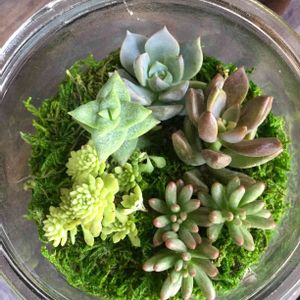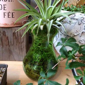 春に果実酒のビンに作ったテラリウム。 働いているお店に見本として 置いていましたが今日で引退。 見やすいように蓋を開けていたので カサカサになりました…。