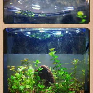 浮草、サルビニア・ククラータ🌿 エアレーションの泡で水滴が乗っていたので、接写してみました😌 細かいけばけばが水滴を弾いて綺麗でした✨ 最近の発見ですが、サイアミーズに水中の根を食べられた株は葉っぱが小さく、黄色っぽく育つみたいです😃 左側の色が薄いのがその株ですね 根を食べられても駄目になってしまう訳ではなく、もりもり増えるのは変わりません😉 手前側に新芽が出てきてます😆 これはニトリさんのガラスシリンダーに入っているんですが、入れたい流木のアク抜きが終わらず💦いまだにレイアウトができていません😖 水につけたまま早数カ月…水がまだ茶色くなるけど、そろそろ入れちゃおうかなぁ🤔
