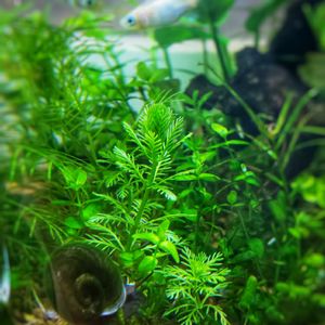 ミリオフィラム・ガイアナドワーフ🌿 上見水槽で自由本に伸びまくっていたものをシロメダカボトルへ…😉 さっそくラムさん🐚が寄ってきました😃 シロメダカさんの方はあんまり興味なさそうです😌