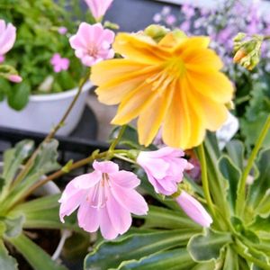 レウィシアさん黄色も又咲いてきました💛 チューリップはまだ2色だけです🌷 パルムは冬の間も咲き続けてくれました💜