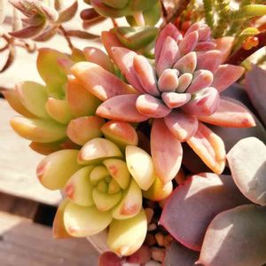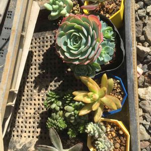 ひっくり返した多肉ちゃんの寄植え①号 落ち着いてきたかな。 慌てていたから色合いも何も考えるゆとりはなかったけど、元気でいてくれればそれでいいや💕 あれ??黄色い子はなんだっけ?