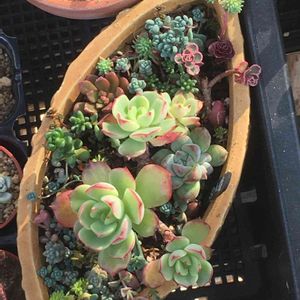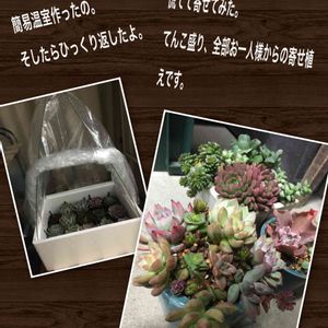 おはようございます。 一昨日発泡スチロールの箱で簡易温室作ったの。なかなかいいじゃん!って多肉ちゃん入れて日中お外に置いて、夕方中に入れようとしたら箱のフチがもげてガシャーン! ひえええええ! 全部中身が転がっていた💦 ずっとお一人様だったけど、一緒の方が水の管理が楽とGSで言ってる方がいたので寄せてみました。 こんなに詰めた事ない、でも皆さんもっと詰めますよね。潰しちゃいそうで怖い〜、ムリムリ入れてるから土が溢れる〜💦 なんとか頑張って多肉ちゃん💦