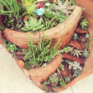 先日の台風て割れた植木鉢で初めてのブロークンポットガーデンを作ってみました!! 若緑が木のようなイメージでいい感じ♪ 小物がちゃっちいですけど(^_^;)初作品なのでこんなもんですな。 これで土もれてこないのか不安。。