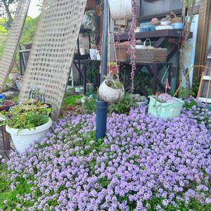 おはようございます~😉 2日夜、大雨警報にて風雨強く、お花や畑の心配をしましたが、全く被害はなくホッとしました~🤣🎉 今日は、畑にあるお花を見てください〜💠💞 ①アリウム(白) ②アリウム(紫) ③アリウムとキンセンカと矢車菊🧡💙 ④クリーピングタイム🩷🩷 ⑤クリーピングタイムとスノープリンセス😆 アリウム(ギガンチューム)白は、背丈が1m位あり風雨で折れなくて良かったです〜😅⤴️ アリウムは初めての購入で、まん丸でかわいいです〜🤭🤍💜 梅雨前には、忘れず掘り上げなくては〜🤍💜 クリーピングタイムは3年目かな~、たった1ポットを2つに分けて植え付け、今では1mオーバーです〜😄⤴️ 生育旺盛で、雑草対策には最適で右に出るものは無いのではと思うくらいです〜🤣⤴️ スーパーアリッサムスノープリンセスは、挿し芽株の冬越し株です〜🤣 この子も旺盛で、クリーピングタイムとで通路が無くなってしまうかも〜😅🌀 夏野菜も植え付け、お花の入れ替えも終わり、良く頑張ったなぁ〜と🤭🎉 まだ、お花の種取りがある〜😅 家の東側で、結構綺麗にパンビオが咲いているのです〜😆🩷 〈💞ボチボチやりましょう〜💞〉