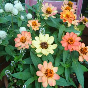🌕🌱ビタミンカラーのジニア🎵 白のセンニチコウに、いっぱい増えちゃったクリーピングタイムをちょっとだけ(^m^ ) また明日からお仕事だ(^^; 頑張ろ╰(*˘︶˘*)╯ね🎵