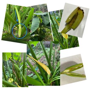 9月にサトイモの花を投稿しました。花と言っても本当は仏炎苞と言われる苞、黄色いスマートな花でした。 はたしてこれがどうなるのか、ご報告するつもりでしたが、うっかりそのままになっていました。 花の後、実のように見えた部分を解剖したのが右側の2枚。中にあったのは雄花雌花がくっついた多分、肉穂花序と呼ばれるもの。10月はじめに撮って下旬にコラージュ(?)していました。 1株だけだったのにたくさんの里芋がとれましたよ。
