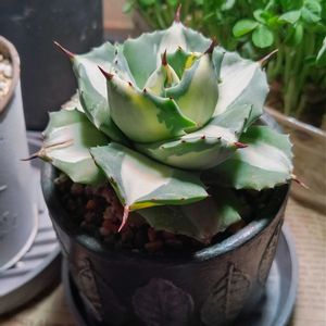 こんばんは☺️ ベランダはまだ暖かく、寒くなるよ〜ってずっと天気予報で言ってるけどなかなか植物達を取り込めない😅 アガベ 王妃雷神黄中斑❣️ 長年育てているけど今までで1番調子が良い🥰🥰 やはりお水多めで育てたのが良かったのかな 斑も綺麗に入っていて惚れ惚れする美しさです🤩💕