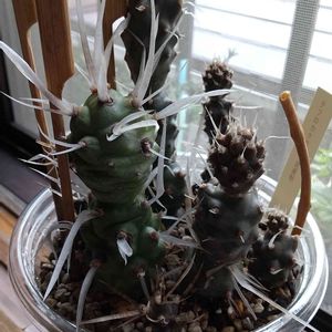 ♻️私のSDGs♻️part6 この子達は、サボテン科武藏丸と長刺武藏丸。 このような段重ねタイプは、何かの弾みで、ポロリと落ちることが多いです😨 ですから、本体を支える役目と、頭を押さえる役目の二役をこなす焼き鳥の串や少し曲がった枝を使って支えています😊