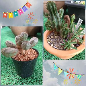 🚩😃🚩フレーフレー📣 今日は運動会、体育祭の学校もありましたね。 お子さん、保護者の皆さん、 お疲れさまでした😌💓 我が家のこの子達も、応援していましたよ➰q(*・ω・*)pファイト! トウダイグサ科 ユーフォルビア属 左:オベサブロウ 右:紅彩閣、峨眉山の寄せ植え