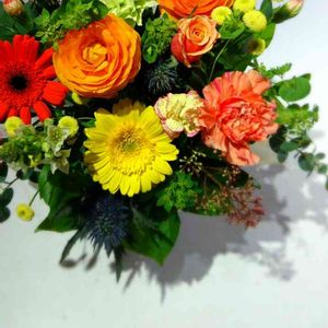 バスケットアレンジ 去年の5月のレッスン グロリオサ スナップ ひまわり バラ カーネーション ブプレリウム マルバルスカス テンモンソウ ドラセナ