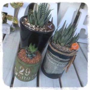 右側自作のリメ缶に十二の巻植えた〜( ૢ⁼̴̤̆ ꇴ ⁼̴̤̆ ૢ)~ෆ似合うかも❤️ グリーンのリメ缶は先月のイベントでグリコさんに頂いた大切なリメ缶(*✪▽✪*) 鷹の爪植えてみたよ(⸝⸝˃̶͈ ૢ ૢ˂̶͈⸝⸝)