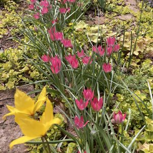 うちではチューリップは鹿の大好物で毎年咲く前に食べられてしまうのですが、この原種系のチューリップはリス?にイタズラされることはありましたが、鹿は食べないのでこっちを少しずつ増やしています💓💓 今日一斉に咲き出しました。