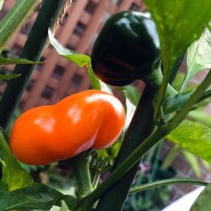 フルーツパプリカが色づいて、季節外れの初収穫❣️ カラーミックスの種から育てたので、何色の株なのかわからずにいたけど、オレンジだったみたい😆
