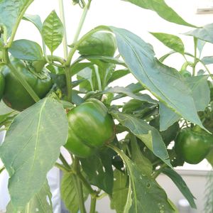 いまさら!フルーツパプリカが豊作です😲⚡ 9Lほどの極小プランターに1株、第一果を摘果しそびれて他の実がボロボロ落ちて、結局まともに収穫できたのは2個だけ…長雨で色づく前に腐ったり… 今10個くらいできてます!でもパプリカって色づくまでが本当大変💦 もうピーマンとして食べた方が無難でしょうか?どなたかアドバイスを😣!