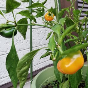 なす科 我が家のフルーツパプリカ セニョリータゴールド ソラナムパンプキンに似てるでしょ 小さいけれど美味しいよ😃 落ちた緑色も 生でたべたよ。まだまだ収穫できそう😆