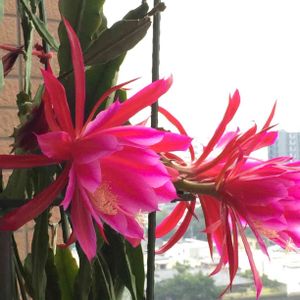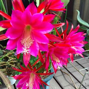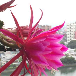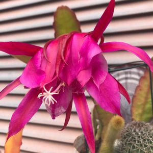 クジャクサボテン 今年の初花❣️ 艶々の花びらは、 羽根の様に透けています。 蕾があと9個も…3日花だから、 いく花か、一緒に咲く所が見たい〜^ - ^