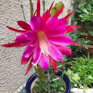 おはようございます😃クジャクサボテン咲きました!昨年の台風で溝に流されたのを救出し植え替えて冬越しました!一輪ですが大きな花です🌼