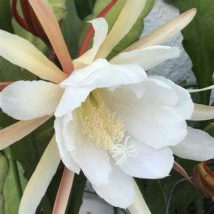月下美人❣️と思いきやー🤣💦 朝、実家の義姉から白い花が咲いてるよーと電話あり😃 もしかしてと期待してすぐ行ったけど、 ①香りがしない ②9時頃でも咲いている ③極薄いピンク色 ④葉にトゲほどではないが突起がある というわけで、サボテン科クジャクサボテン属の月下美人によく似ているけれど、これはクジャクサボテンの花でした〜🤔😪🤣