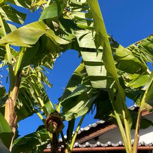 名古屋市熱田区のとあるお寺にて。 バナナかと思いましたが なにかの実がなっていました(*^^*) 青空に緑がとっても映えます。