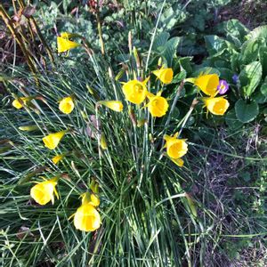 ナルキッスス・バルボコディウム (ペチコート水仙) 小型原種スイセン 見た目はお馴染み水仙ですが、草丈は10〜20センチで花も2センチ位の可愛らしい姿でした。 手前がピンぼけですみません🙇♀️