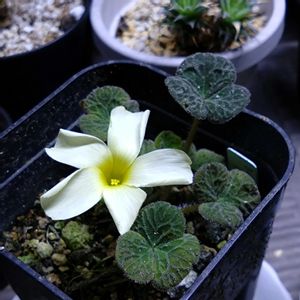 ①オキザリス ダークリーフ ②細葉のオキザリス(名札は読めない) この2つは蕾が出ても天気が悪くて何日経っても咲かないので、今朝5℃の風除室から14℃の内玄関に入れました。 LEDの下に置いたら2時間で開きました🎉 意外と寒がりなんですね。 それならと③つぶつぶオキザリスのブルラータも中に入れてあげました。 ④フェルグソニアエは昨日の昼頃まで外置きで、雪を被ってしまったので風除室に入れたばかり。 すぐ室内に入れると温度差があるからもう少しここ風除室に置いておきます。 ⑤今の玄関前❄ 昨日より雪の降りが強く、しんしん降り積もっています☃️🏔️ 湿った雪で重いんでしょう、南天の雪囲いが壊れました。直さないと倒れてしまうなあ😮💨