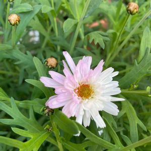 花の半分がピンクで半分が白の不思議な菊科の花です。PWのカンパニュラにいつのまにか混じっていた子ですが育ててみたら面白い花が咲きました♪