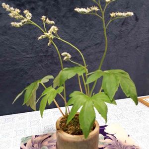もう 花は、終わりました。竹の鉢も 色が、落ち 水みずしさは、無いです。イワヤツデ