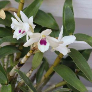 デンドロビウム。 小さめの軽石の鉢に植えてたから花は咲かないと思ってたら今年初めて咲きました😄