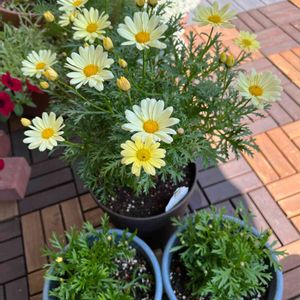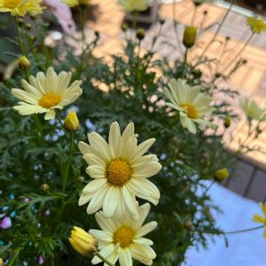 PWマーガレット デイジーイエロー。 ホムセンで見切り品として売られていたところをお迎え。 切り戻しして植え替え、挿し芽もしてここまできれいに咲くようになりましたー😆✨ 挿し芽にした子達もつぼみが付開花まであと少しです。
