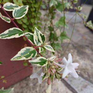 斑入りの葉っぱの先にちっちゃい白いお花 可愛い💕
