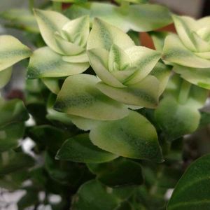 クラッスラ南十字星 (ベンケイソウ科クラッスラ属) 「星の王子」と言うクラッスラ属の品種が斑入りとなったのが「南十字星」です春になると淡いビンク色の小さなお花がわんさか咲くそうです 十字の方向に葉を積み重ねてつきます 緑地に黄色い縁取りが入りますが 縁取りの幅が広いので黄色地の真ん中に緑色の筋が入っているようにも見えます 秋以降の低温期には葉の縁が赤紫色紅葉するようです