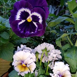 パンジーボニータ三兄弟 まだまだ咲いています✨ 家の南側だともう暑すぎなので、北側の玄関に移動してきました。 日中、ほどよく日向になります。 左のブルーティフルは、こぼれ種から発芽した苗です♪ こんなに大きくなりました!! スゴイでしょ😆 後ろの黄色い花は、 フリンジビオラ バレリーヌのチュチュ こちらもお元気✨✨