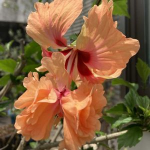 ハイビスカス🧡オレンジフラミンゴ やっとポツポツ咲きだしましたが、やっぱり花数が例年より少ないです😞